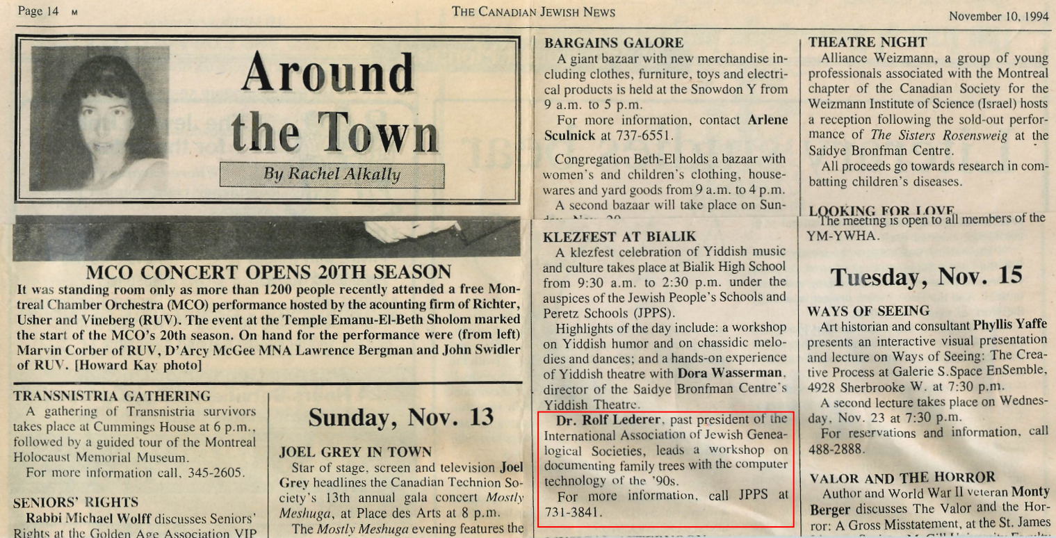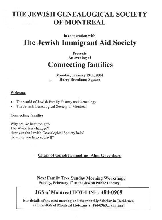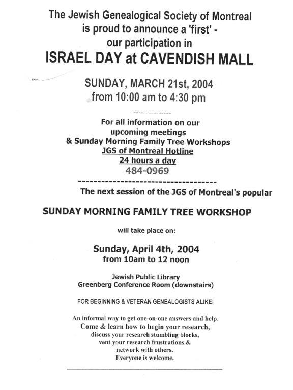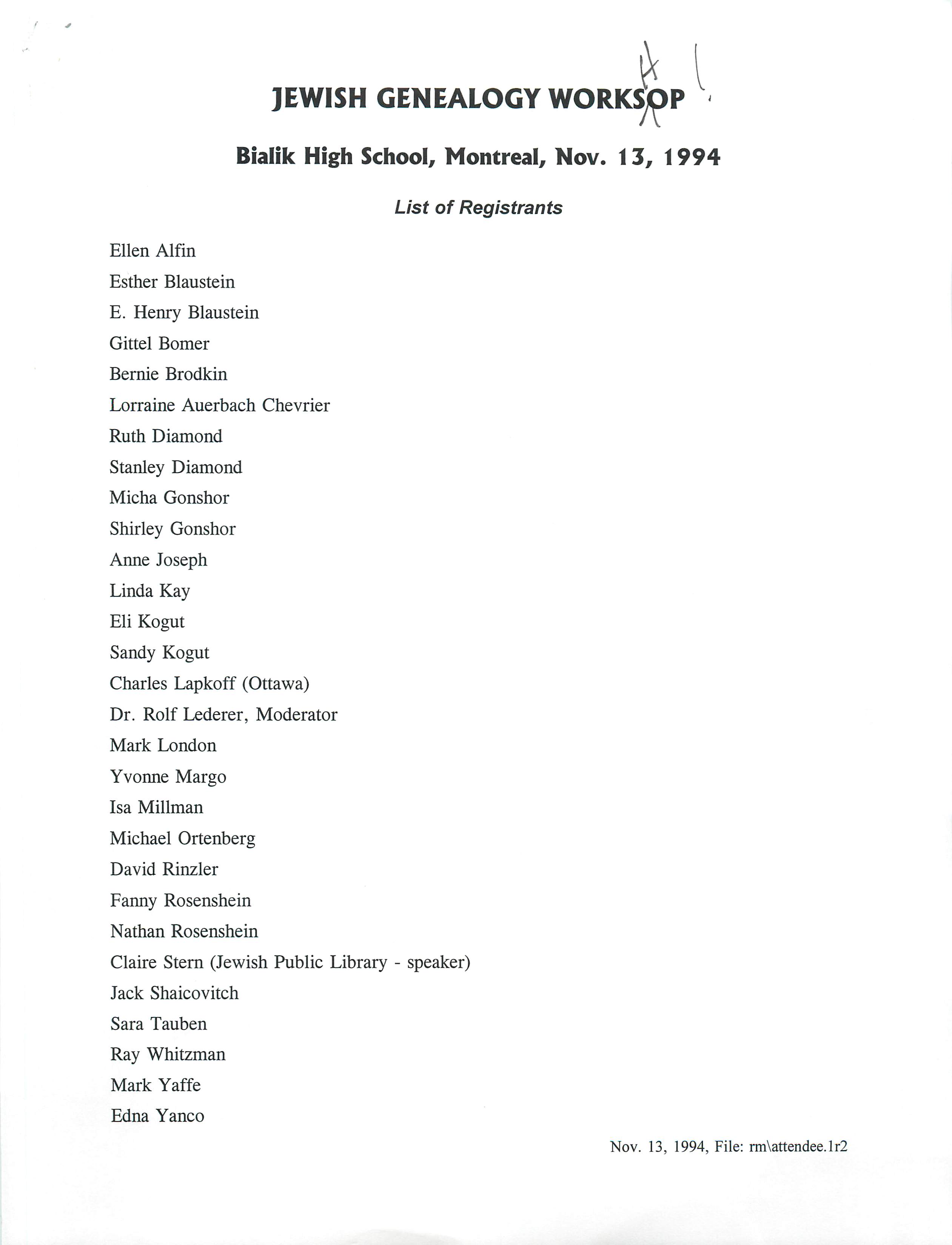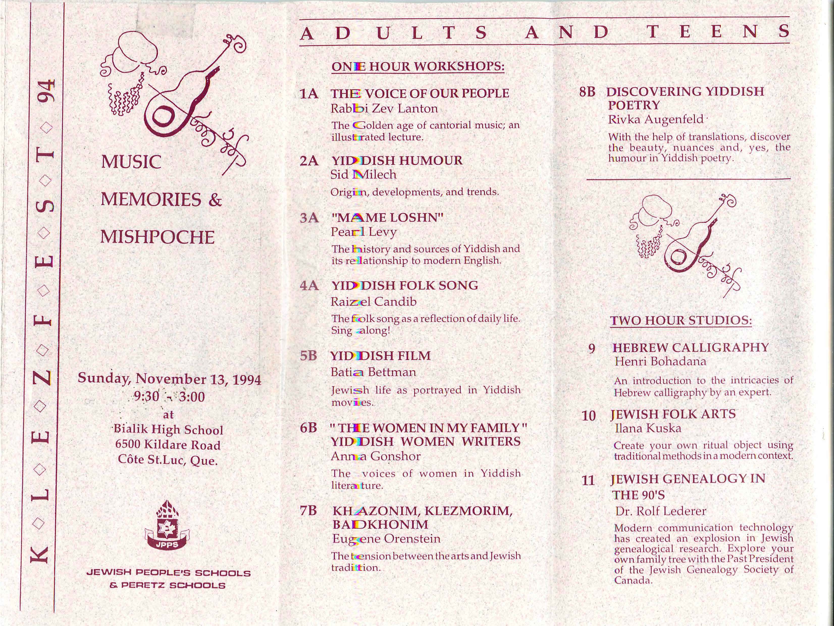 The workshop will be just one part of the activities at the Jewish Peoples School & Peretz School's KLEZFEST 94 taking place at Bialik High School, 6500 Kildare Road, Côte St. Luc, Que. Historical Documents on the Formation of JGS-Montreal: