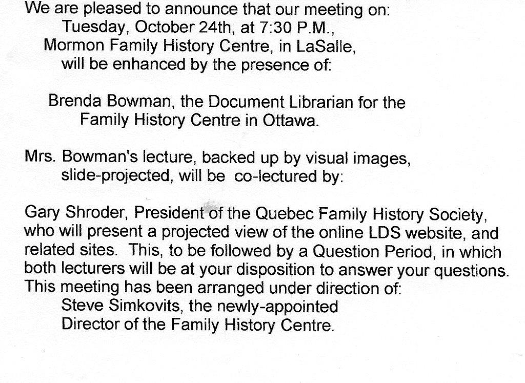 "Genealogical Research in Canada - The Connection to your European Origins" - Gary Schroder (V.P., Quebec Family History Society) | ||