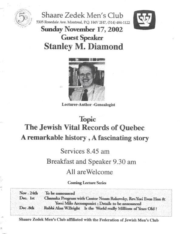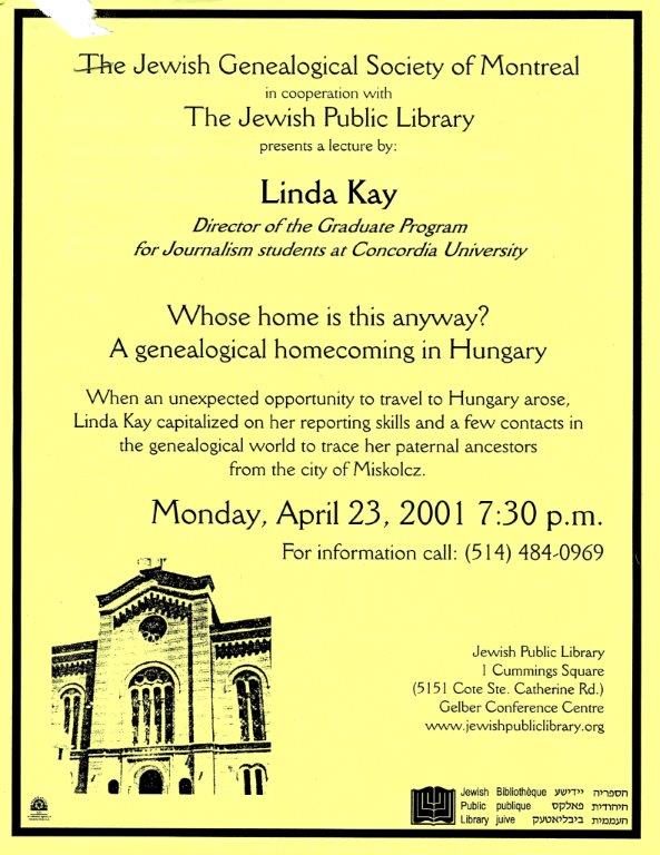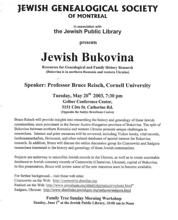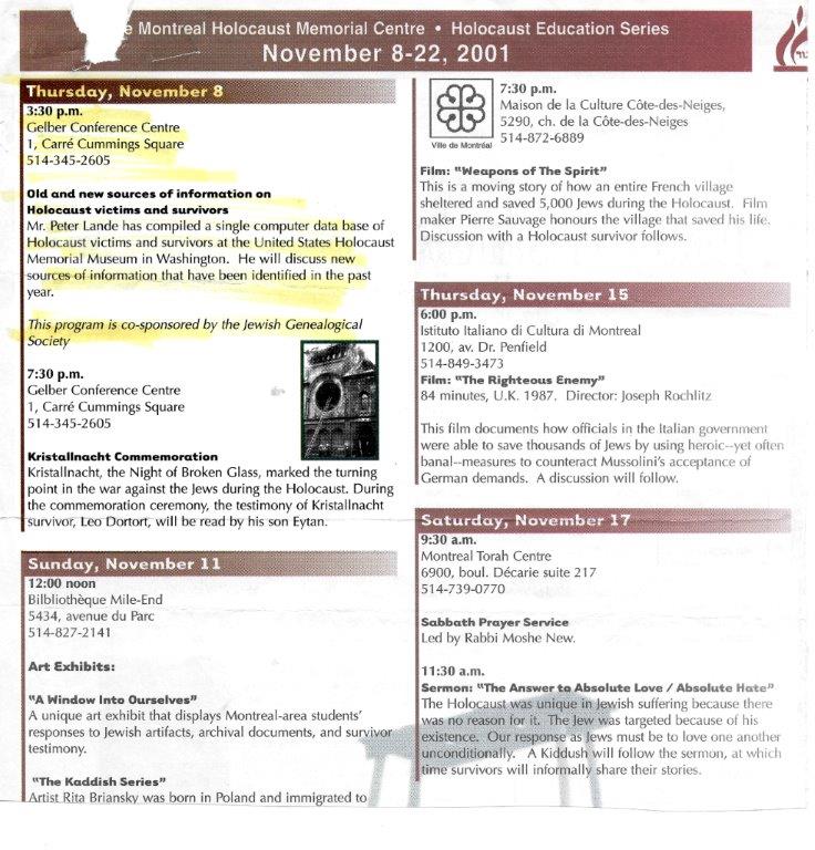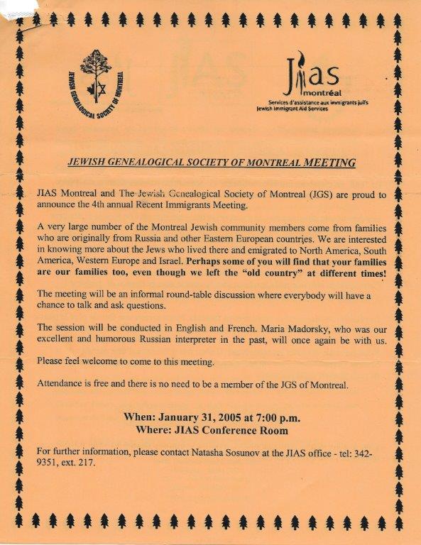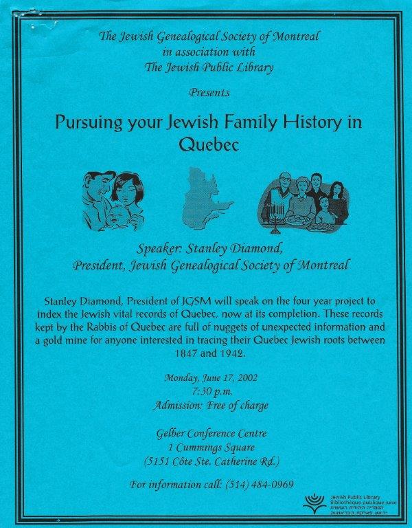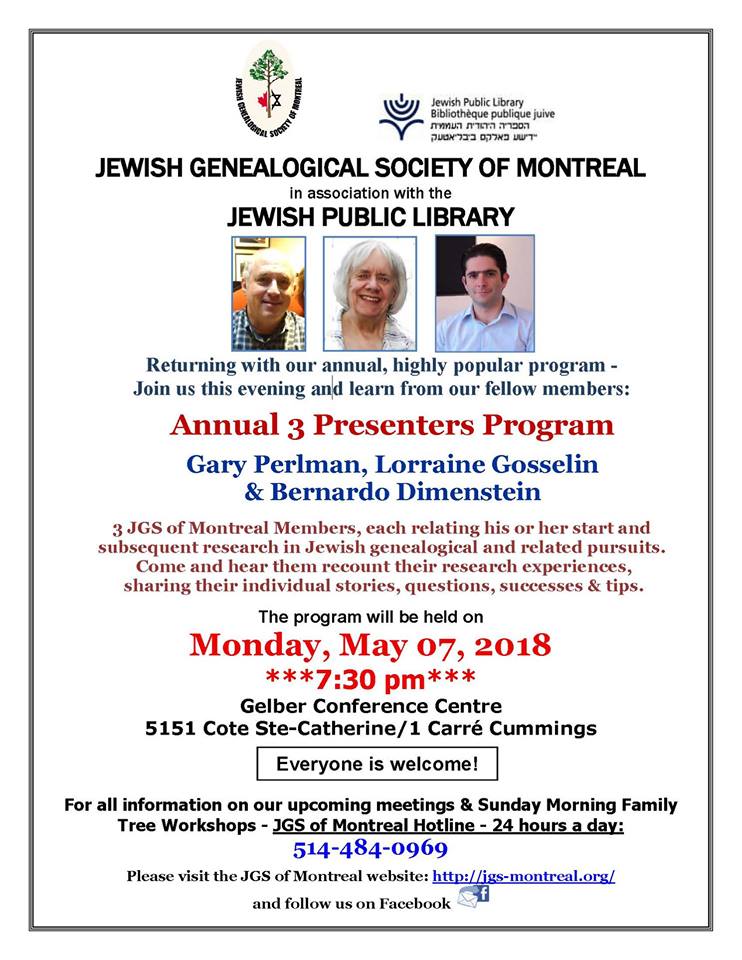 This is an archive of over 200 monthly meetings of the JGS of Montreal dating back to 1994. Each year's meetings are in a separate table. Links like this: will show a PDF of the meeting announcement. For some presentations, we have the presenter's , , image, or a video.