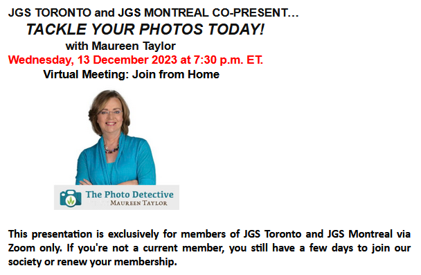 A gift of a box or more of photographs can be seen as such an overwhelming task that it is easier to leave them for the next generation. The problem is that the next generation does not always know what to do with them either, so the images get thrown out. This presentation gives you tips to solving the problem. Maureen Taylor is on a mission to give you the skills to tackle those images. Before you can say "prevent picture puzzles," you will be on your way to identifying, preserving, and organizing your photos. Photo preservation used to be complicated and expensive, but that is no longer the case. A joint presentation of the Jewish Genealogical Societies of Toronto and Montreal. A special members-only event. A link will be sent to all members of both Societies prior to the meeting. No pre-registration required. |